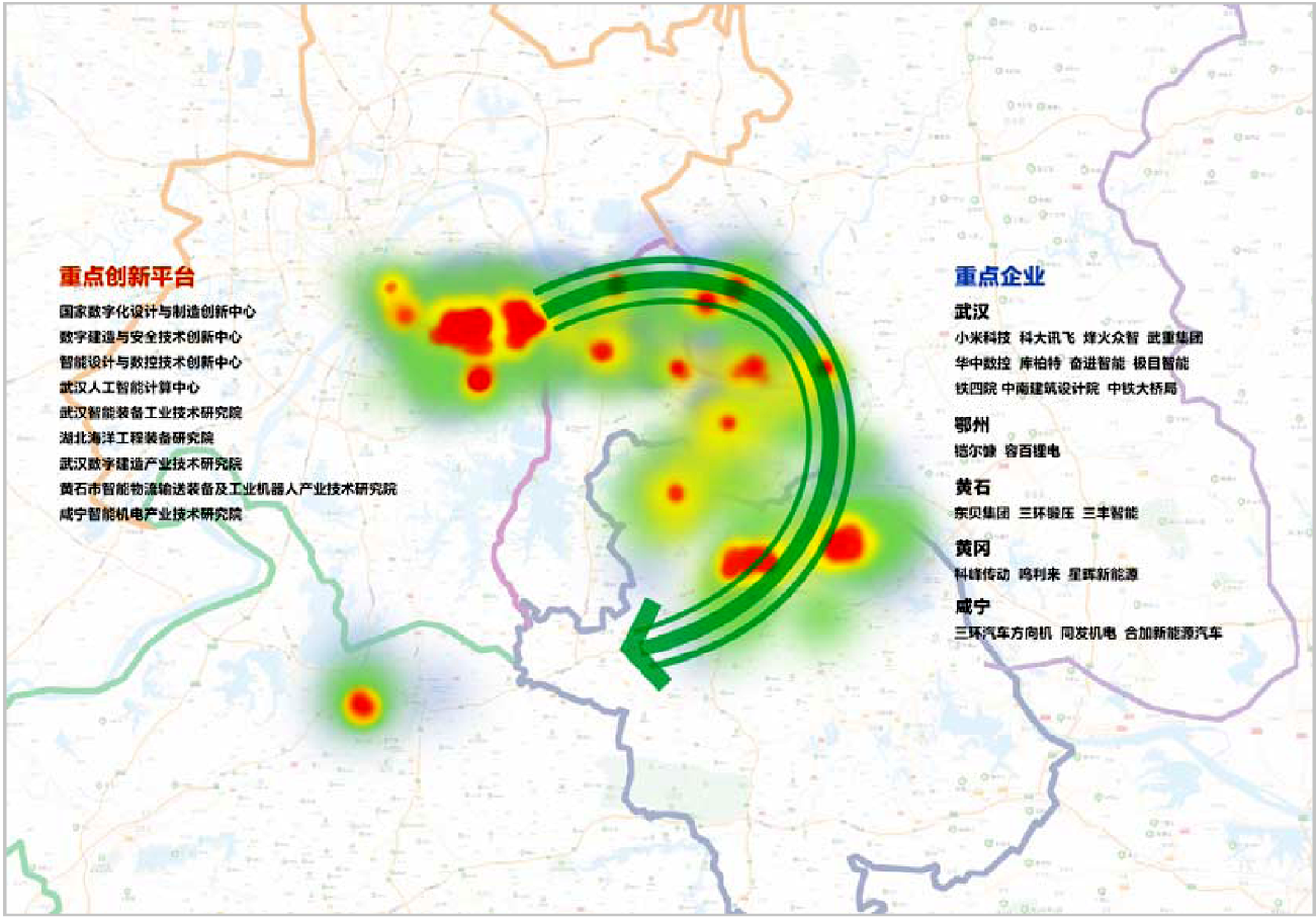——智能产业带。抓住国家新一代人工智能创新发展试验区建设机遇,加快重大创新平台和应用场景建设,突破关键核心技术,推进融合应用创新,引进培育世界级龙头企业,若干细分领域进入全球第一方阵;加强与“鄂黄黄”临空经济区、黄石经开区、咸宁高新区等园区协同创新,带动智慧物流、智能模具、智能机电、工业机器人等产业高端化发展。