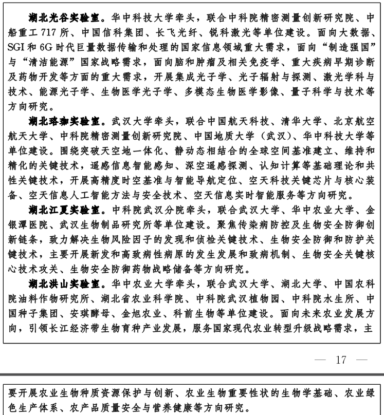 建设高水平实验室。服务国家战略,强化总体部署,依托高校院所和重点企业,对标国家实验室组建方案,构建由光谷实验室、珞珈实验室、江夏实验室、洪山实验室、东湖实验室、九峰山实验室等组成的湖北实验室体系,开展战略性、前瞻性、基础性研究,为经济建设、社会发展和国家安全提供科技支撑。光谷实验室重点面向光电科学,开展集成光子学、光子辐射与探测、多模态生物医学影像等方向关键核心技术研究。珞珈实验室重点面向空天科技,开展高精度时空基准与智能导航定位、空天科技关键芯片与核心装备等方向关键核心技术研究。江夏实验室面向生物安全,开展新发突发传染病病原、生物安全防护、侦检装备和疫苗药物等方向关键核心技术研究。洪山实验室重点面向生物育种,开展农业生物绿色优质品种培育、农业绿色生产体系、农产品质量安全与营养健康等方向关键核心技术研究。