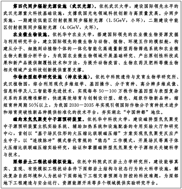 加快建设重大科技基础设施群。持续支持脉冲强磁场国家重大科技基础设施功能提升,加快建成精密重力测量国家重大科技基础设施,加快推进生物医学成像设施、第四代同步辐射光源(武汉光源)设施等重大科技基础设施建设,谋划新建农业微生物设施、作物表型组学研究设施(神农设施)、磁约束氘氘聚变中子源预研装置、深部岩土工程扰动模拟设施等重大科技基础设施。建立重大科技基础设施新型运行机制,加强与湖北高校院所、企业有机衔接,打造共建共享、开放协同、共同创新的重大科技基础设施群。