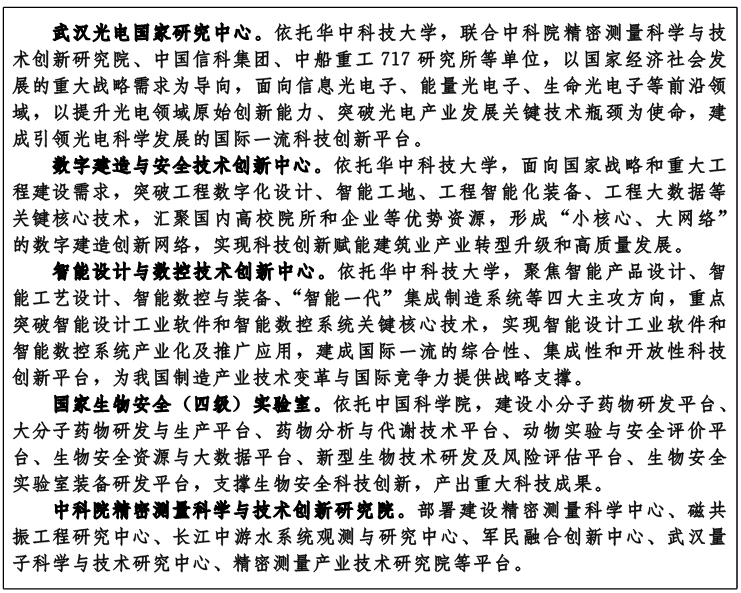 布局交叉前沿研究平台。推动中国科学院、在鄂高校院所等多方参与,布局建设一批跨学科、跨领域交叉前沿研究平台,提高集成创新能力,提升光电、生物、智能等领域科技创新国际影响力。支持武汉光电国家研究中心提升原始创新能力、突破关键技术瓶颈,建成引领光电科学发展的国际一流研究平台。支持中科院东湖科学中心建设,推进精密测量科学与技术创新研究院、国家生物安全(四级)实验室等研究平台建设。支持华中科技大学、武汉大学围绕优势学科,建设数字建造与安全、智能设计与数控等研究平台。