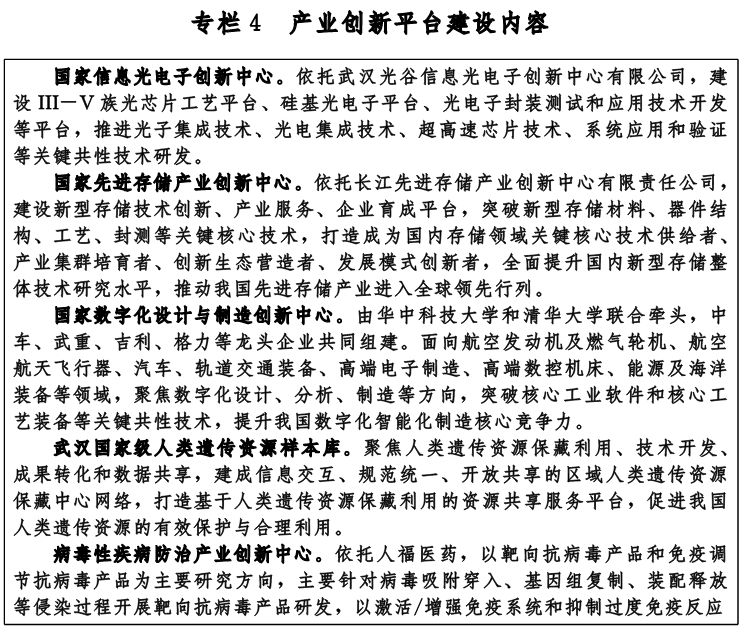 建设一批产业创新平台。支持龙头企业面向主导产业与未来产业发展需求,联合全球创新力量,围绕下一代通信、集成电路、生命健康、人工智能等领域,建设产业创新中心、制造业创新中心。支持华为、阿里巴巴、腾讯等龙头企业设立研发总部。加快建设武汉国家级人类遗传资源样本库、武汉人工智能计算中心等创新平台。