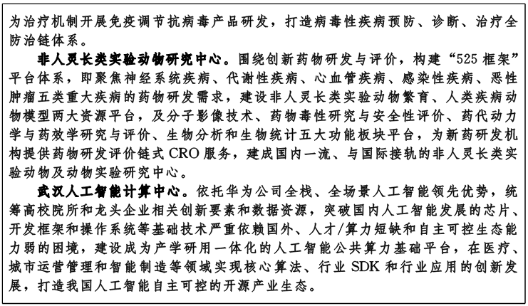 武汉片区强化创新引领作用,依托洪山实验室、国家生物安全(四级)实验室、高端生物医学成像设施、武汉国家级人类遗传资源样本库、武汉生物技术研究院等重大创新平台,支持人福医药、联影医疗、华大基因、省种子集团等龙头企业发展,加强高端生物医药、医疗器械、生物农业产业发展与新产品研发布局,加快发展精准医疗、智慧医疗等新型医疗服务。